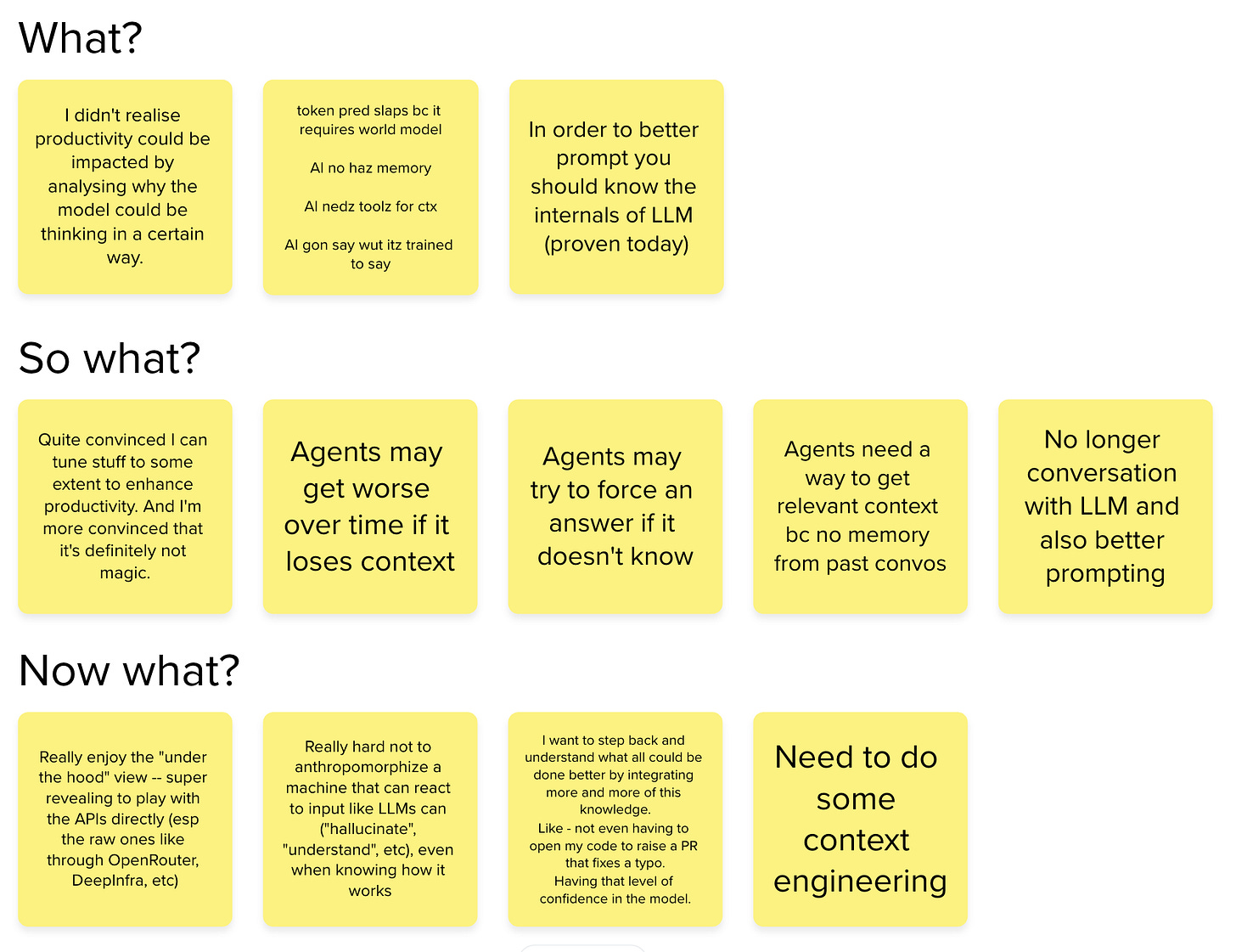 Here, I asked the team to spend 5 minutes hypothesising how an AI chatbot might work, hoping for them to build a stronger learning connection. Unfortunately, I didn’t get any good answers as my questions were poorly written.