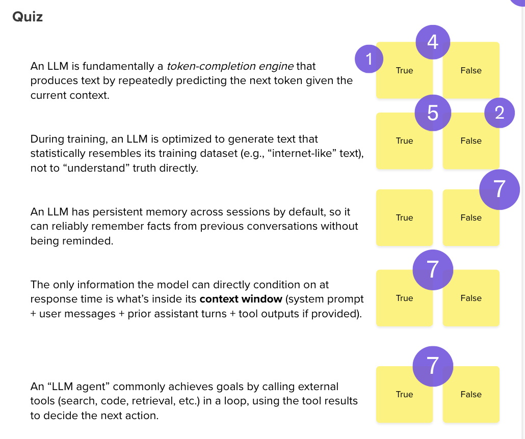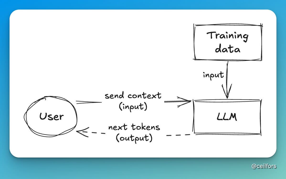 This idea is an oversimplification at best, but one thing I emphasise over and over again throughout the learning hour is the idea that there are only two inputs to LLM to produce output (next tokens). Arguably, the training data could be framed as a database, but it doesn’t really matter at this point. I thought this oversimplification was necessary to build the foundational understanding of LLM.
